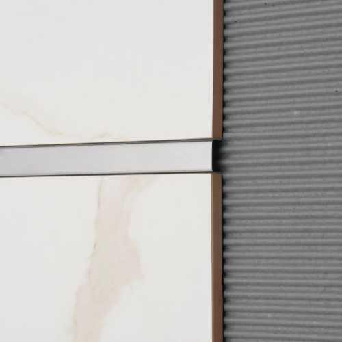 Perfil de acero inoxidable 430 con 10 mm de cara visible que se utiliza como guarda entre diferentes tipos de revestimientos. Su diseño fino permite crear detalles minimalistas en acero.